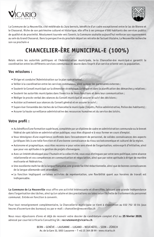 La Commune de La Neuveville, cité médiévale du Jura bernois, bénéficie d’un cadre exceptionnel entre le lac de Bienne et le Chasseral. Riche de son patrimoine culturel et historique, elle offre à ses presque 4’000 habitants des services publics de qualité et de proximité. Résolument tournée vers l’avenir, la Commune souhaite aujourd’hui renforcer son rayonnement au sein du Grand Chasseral. Dans la perspective du prochain départ en retraite de l’actuel titulaire, La Neuveville recherche son-sa prochain-e : CHANCELIER-ÈRE MUNICIPAL-E (100%). Lire la suite….